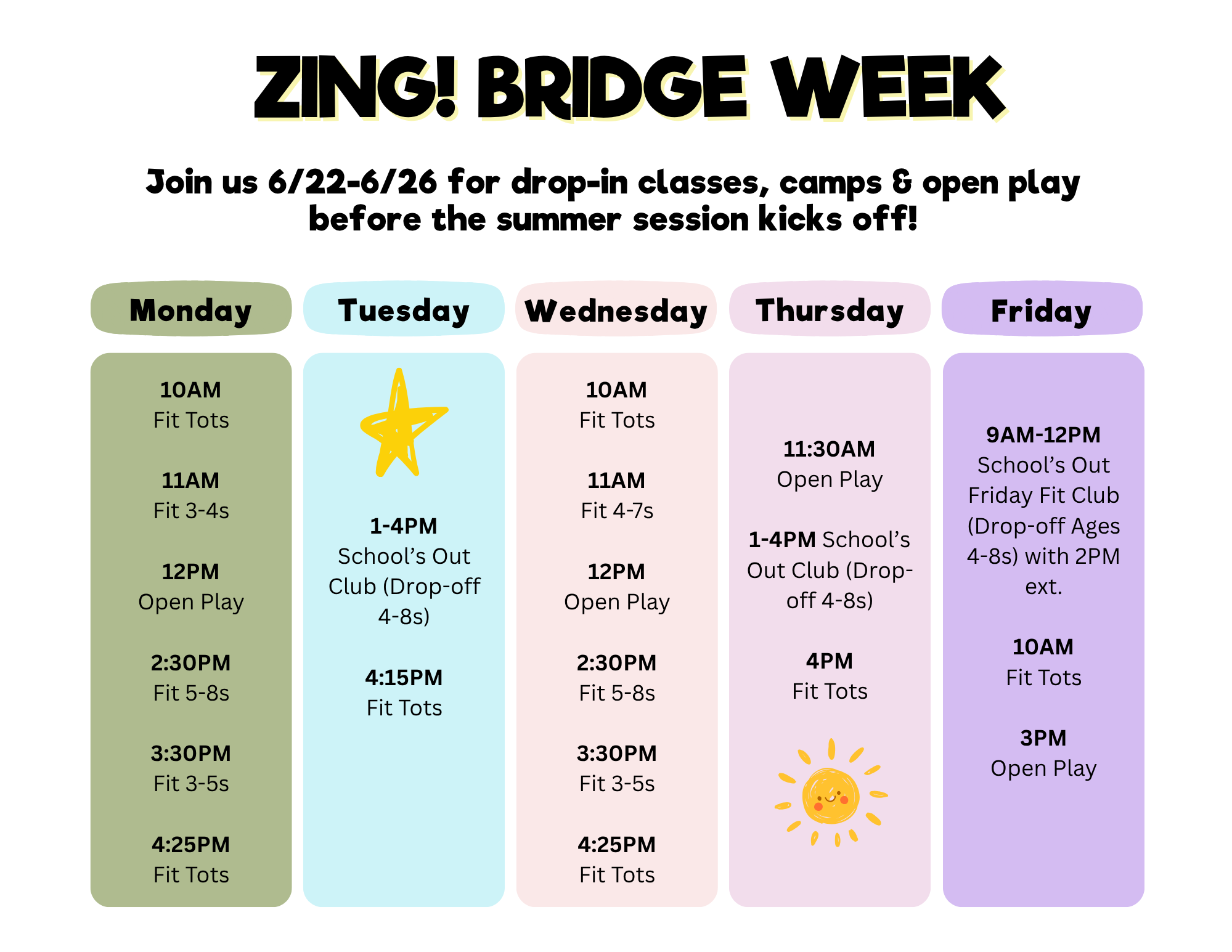 BRIDGE WEEK 6/22-6/26: For that special time between school and our summer session starting, we’re hosting pop-ups to keep the kids moving and feeling strong (while giving you a breather!)